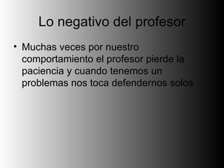 El documento habla sobre las cualidades positivas y negativas de un profesor desde la perspectiva de los estudiantes. Entre las positivas se destaca que valora el trabajo de los estudiantes, se preocupa por que su grupo sea el mejor y ayuda a solucionar los problemas de los estudiantes. Entre las negativas está que a veces pierde la paciencia cuando los estudiantes se portan mal. El documento también identifica áreas de mejora para los estudiantes como escuchar más, llegar a tiempo a clase, mejorar el comportamiento y ser más responsables. Por último,