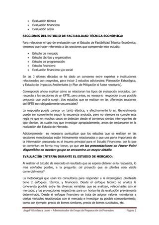 La evaluación de proyectos consiste en analizar propuestas de inversión desde distintas perspectivas como la técnica, financiera y social. Se realiza tanto de forma interna por los consultores que preparan el proyecto como de forma externa por analistas financieros. La evaluación financiera interna analiza la rentabilidad del proyecto mediante indicadores como la tasa interna de retorno, mientras que la evaluación externa valida también los aspectos técnicos además de los financieros.