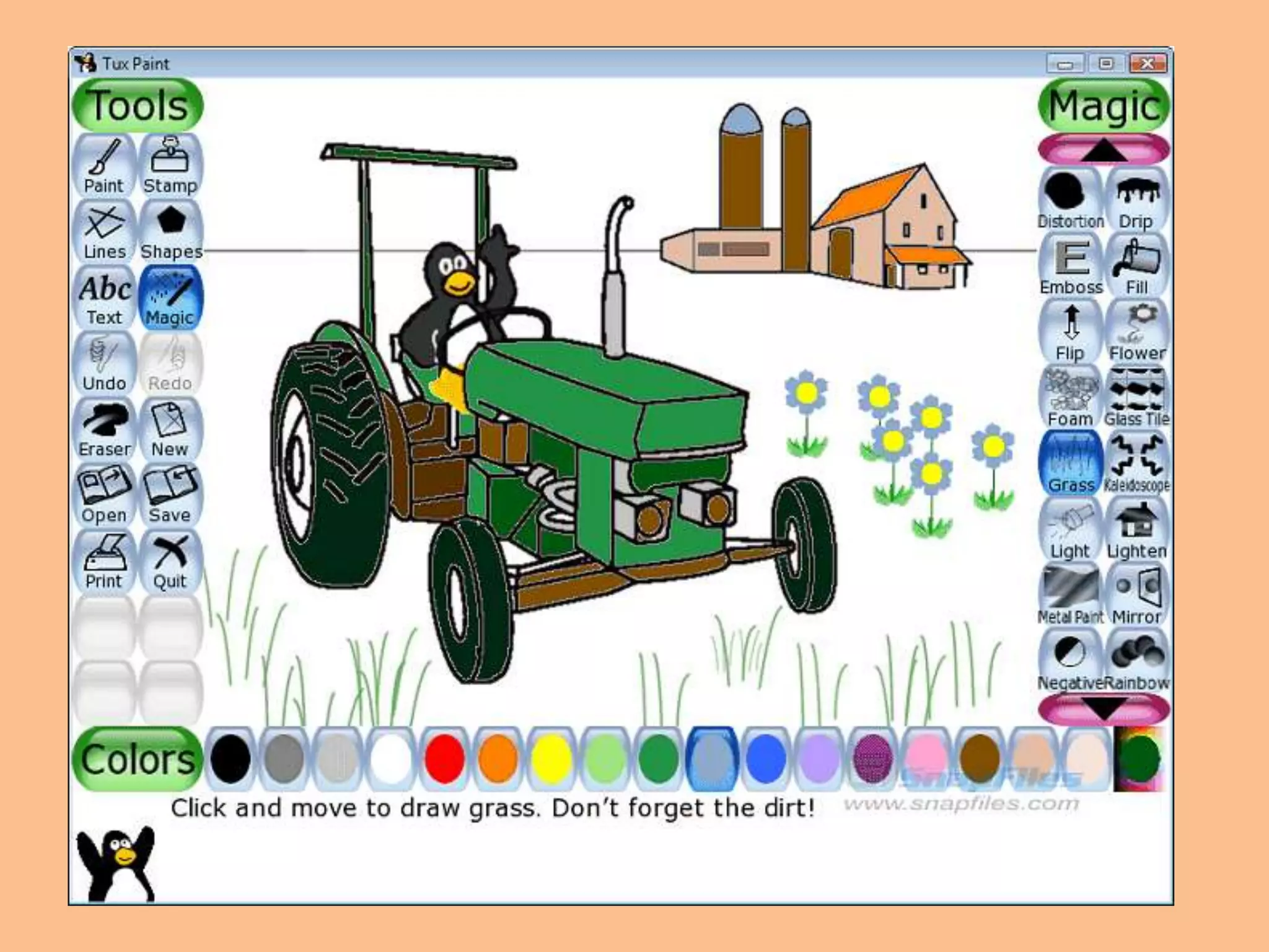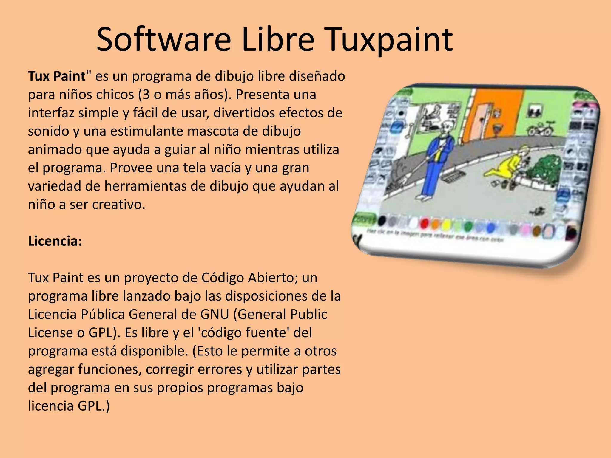 Tuxpaint es un programa de dibujo libre y gratuito diseñado para niños pequeños de 3 años en adelante. Proporciona una interfaz sencilla con herramientas de dibujo y efectos de sonido para estimular la creatividad de los niños. Está disponible bajo la licencia GPL, por lo que el código fuente puede ser modificado y utilizado por terceros. Sus objetivos son ser simple, divertido y extensible para diferentes plataformas a fin de fomentar la expresión artística de los más pequeños.