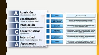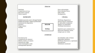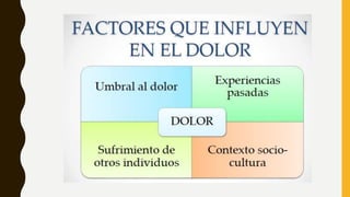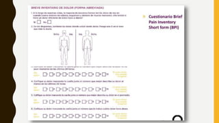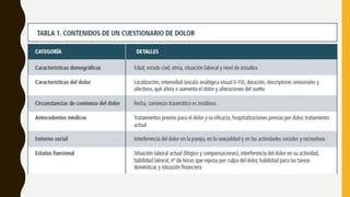 La evaluación del dolor requiere una perspectiva multidimensional que incluya factores físicos, conductuales y biopsicosociales. Se utilizan cuestionarios, escalas como la EVN y EFV, y exámenes físicos y neurológicos para medir la intensidad del dolor y su impacto. Un tratamiento efectivo depende de una valoración correcta de todos los aspectos de la experiencia dolorosa del paciente.