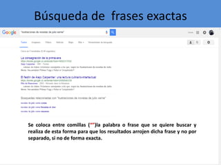 Este documento describe diferentes tipos de búsquedas que se pueden realizar, incluyendo búsquedas de frases exactas utilizando comillas, búsquedas con restricciones omitiendo palabras específicas con un guión, búsquedas por rangos numéricos usando dos puntos, búsquedas de definiciones anteponiendo "define:", búsquedas por tipo de archivo agregando "filetype:", búsquedas en sitios específicos usando "site:", e búsquedas en la URL con "inurl:".