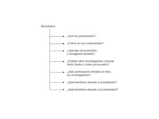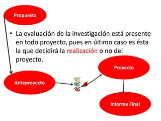 Este documento describe los diferentes aspectos de la evaluación de proyectos de investigación. La evaluación es un paso clave en todo proyecto y puede determinar si el proyecto se lleva a cabo o no. No existe un formato estándar para la evaluación, ya que cada proyecto es único. La evaluación debe centrarse en si el proyecto encaja con las políticas de la organización que lo financia y si aborda el problema de manera profunda. Los equipos de evaluación son preferibles a una sola persona. Después de completar el proyecto, los resultados deb