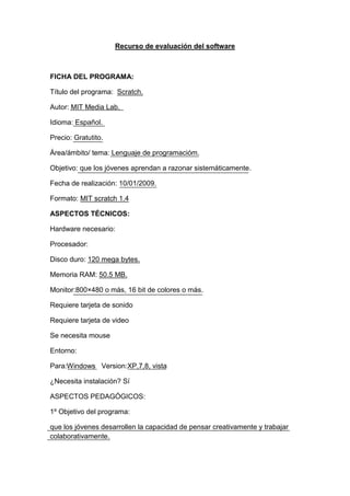 Este documento describe el programa Scratch, un lenguaje de programación desarrollado por el MIT para que los jóvenes aprendan a razonar sistemáticamente de forma creativa y colaborativa. Proporciona detalles técnicos sobre los requisitos del hardware y el software necesarios, y explica los objetivos pedagógicos del programa, como desarrollar habilidades de diseño y resolución de problemas. Finalmente, analiza aspectos positivos como las explicaciones sobre los bloques de programación, y negativos como la posible pérdida de calidad