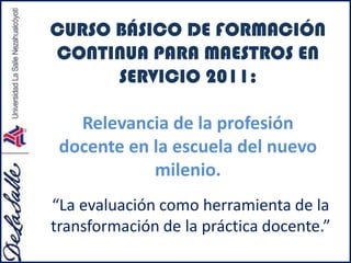 Este documento describe un curso de formación continua para maestros en servicio sobre la evaluación como herramienta para mejorar la práctica docente. Explica que la evaluación es un proceso sistemático, dinámico y continuo que contribuye al cambio de actitudes y rendimiento de los estudiantes mediante la identificación de áreas que necesitan más atención y el refuerzo del aprendizaje. También ayuda a los maestros a tomar mejores decisiones pedagógicas y ofrece retroalimentación valiosa a los estudiant