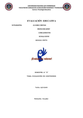 Este documento presenta información sobre la evaluación de contenidos en la educación. Define la evaluación como un proceso continuo y los contenidos como saberes culturales, sociales y científicos importantes para la formación de los estudiantes. Explica que los contenidos se clasifican en conceptuales, procedimentales y actitudinales, y describe cómo evaluar cada tipo de contenido, incluyendo el uso de instrumentos y la importancia de considerar los conocimientos previos de los estudiantes.