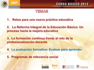 Este documento presenta un curso de formación continua para maestros sobre la transformación de la práctica docente. El curso cubre temas como los retos de una nueva práctica educativa, la reforma de la educación básica, la formación continua de maestros, y la evaluación formativa. El curso también analiza conceptos como la evaluación basada en aprendizajes esperados, el uso de la cartilla de educación básica, y la evaluación universal de maestros y directores con el fin de transformar la práctica docente.