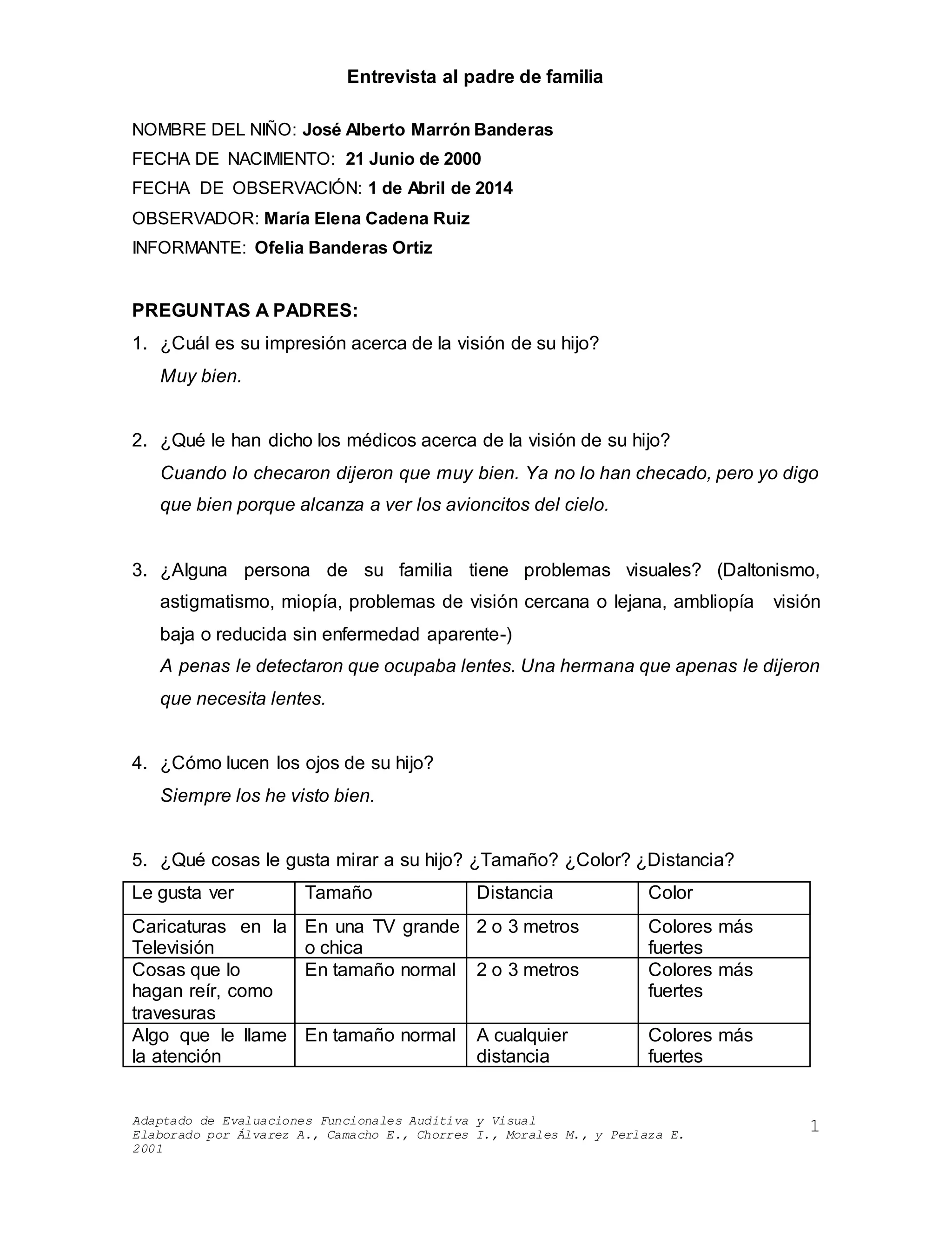 Este documento presenta los resultados de una entrevista y evaluación funcional visual realizada a José Alberto Marrón Banderas de 3 años de edad. La entrevista al padre indica que la visión del niño parece estar bien y que puede seguir objetos en movimiento. La evaluación funcional encontró que el niño puede localizar objetos, fijar la mirada, seguir objetos en movimiento y coordinar la visión con sus manos. Sin embargo, no puede organizar secuencias o usar símbolos visuales.