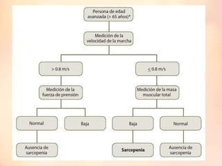 La evaluación geriátrica global consiste en valorar la función física, mental y social del paciente anciano, su cuidador y entorno para planificar los cuidados adecuados y evitar complicaciones. El objetivo es un proceso diagnóstico para cuantificar las capacidades y problemas médicos, mentales y sociales del anciano con el fin de elaborar un plan de atención, prevención o rehabilitación. La evaluación incluye exámenes funcionales de actividades básicas, instrumentadas e índices de marcha y equilibrio para detectar problemas tempranos