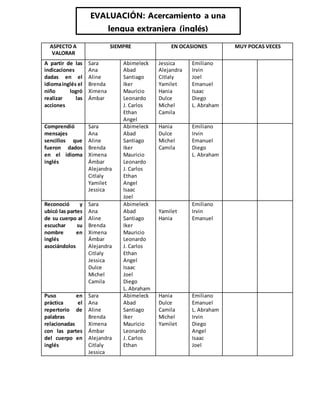 Este documento presenta los resultados de una evaluación de 30 estudiantes en cuatro aspectos relacionados con el aprendizaje del idioma inglés: su capacidad para seguir indicaciones en inglés, comprender mensajes sencillos, reconocer partes del cuerpo al escucharlos en inglés, y aplicar vocabulario sobre partes del cuerpo. Adicionalmente, se evaluó la actitud de los estudiantes hacia las actividades en inglés. Los resultados muestran el desempeño de cada estudiante en cada aspecto evaluado.