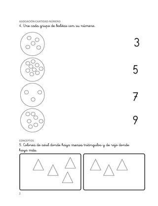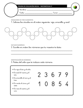 Este documento presenta una prueba de evaluación inicial de matemáticas para primer grado. La prueba contiene ejercicios de seriación, dictado numérico, identificación de números, asociación de cantidades con números, comparación de cantidades, ubicación espacial y selección de objetos.