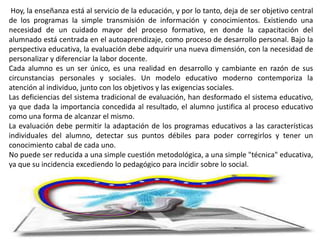 El documento discute los diferentes tipos y funciones de la evaluación institucional. En primer lugar, menciona la evaluación diagnóstica, formativa y sumativa, destacando sus funciones principales. Luego describe la autoevaluación, coevaluación y evaluación externa como estrategias para llevar a cabo la evaluación institucional. Finalmente, resalta que la evaluación institucional es un proceso sistemático y permanente que busca mejorar la calidad educativa.