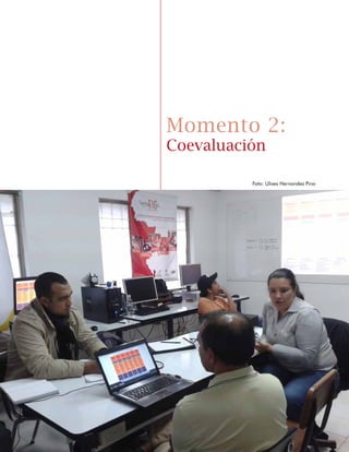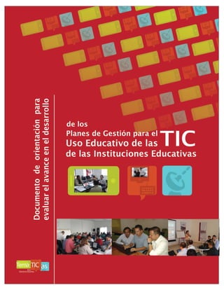 El documento presenta un marco para la evaluación de los planes de gestión del uso educativo de las TIC en instituciones educativas, promovido por el Ministerio de Educación de Colombia. Se detalla un proceso en tres momentos: autoevaluación, coevaluación y socialización, donde se involucra a directivos docentes y líderes formadores para medir el impacto de las TIC en la gestión escolar. Incluye herramientas como matrices de valoración y relatorías para facilitar el seguimiento y mejora de estos planes.