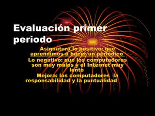 El estudiante evaluó su primer período y resumió lo positivo, negativo y áreas de mejora de una asignatura, el docente y su propio desempeño. Positivamente, aprendió a hacer un periódico y el docente dio tiempo extra para las actividades y tenía buen humor. Negativamente, los computadores eran lentos y faltó responsabilidad y atención en clase. Las áreas de mejora incluyen la puntualidad, responsabilidad e interés del estudiante.