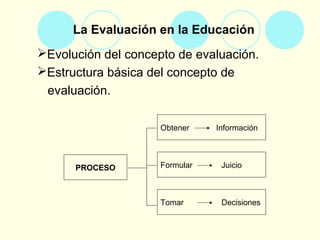 Este documento trata sobre la evaluación educativa. Explica la evolución del concepto de evaluación, su estructura básica y sus funciones. Luego describe los diferentes tipos de evaluación según su momento, finalidad, extensión, agentes evaluadores y normotipo. Finalmente, analiza la importancia de los criterios de evaluación y ofrece reflexiones sobre cómo utilizarlos correctamente.