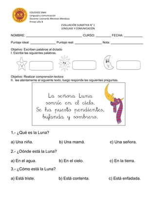 Este documento presenta una evaluación sumativa de lenguaje y comunicación para estudiantes de primer año de colegio. La evaluación contiene 7 secciones con diferentes objetivos como escribir palabras al dictado, responder preguntas sobre un texto de comprensión lectora, completar sílabas iniciales, relacionar palabras con imágenes, transcribir palabras de imprenta a manuscrita, escribir el nombre y apellido, y dibujar objetos con el sonido inicial de una sílaba.