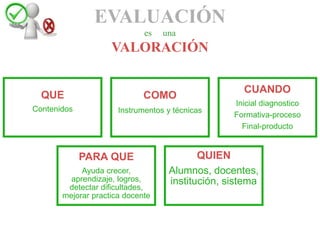 La evaluación es un proceso de valoración continuo que tiene como objetivo ayudar al desarrollo y aprendizaje de los estudiantes mediante la detección de logros y dificultades. La evaluación debe medir las competencias y expectativas de aprendizaje a través de instrumentos y técnicas diversas aplicadas inicialmente para diagnóstico, de forma continua durante el proceso y finalmente para evaluar el producto final. La evaluación beneficia a estudiantes, docentes e instituciones y debe ser un proceso de reflexión, diálogo y mejora continua
