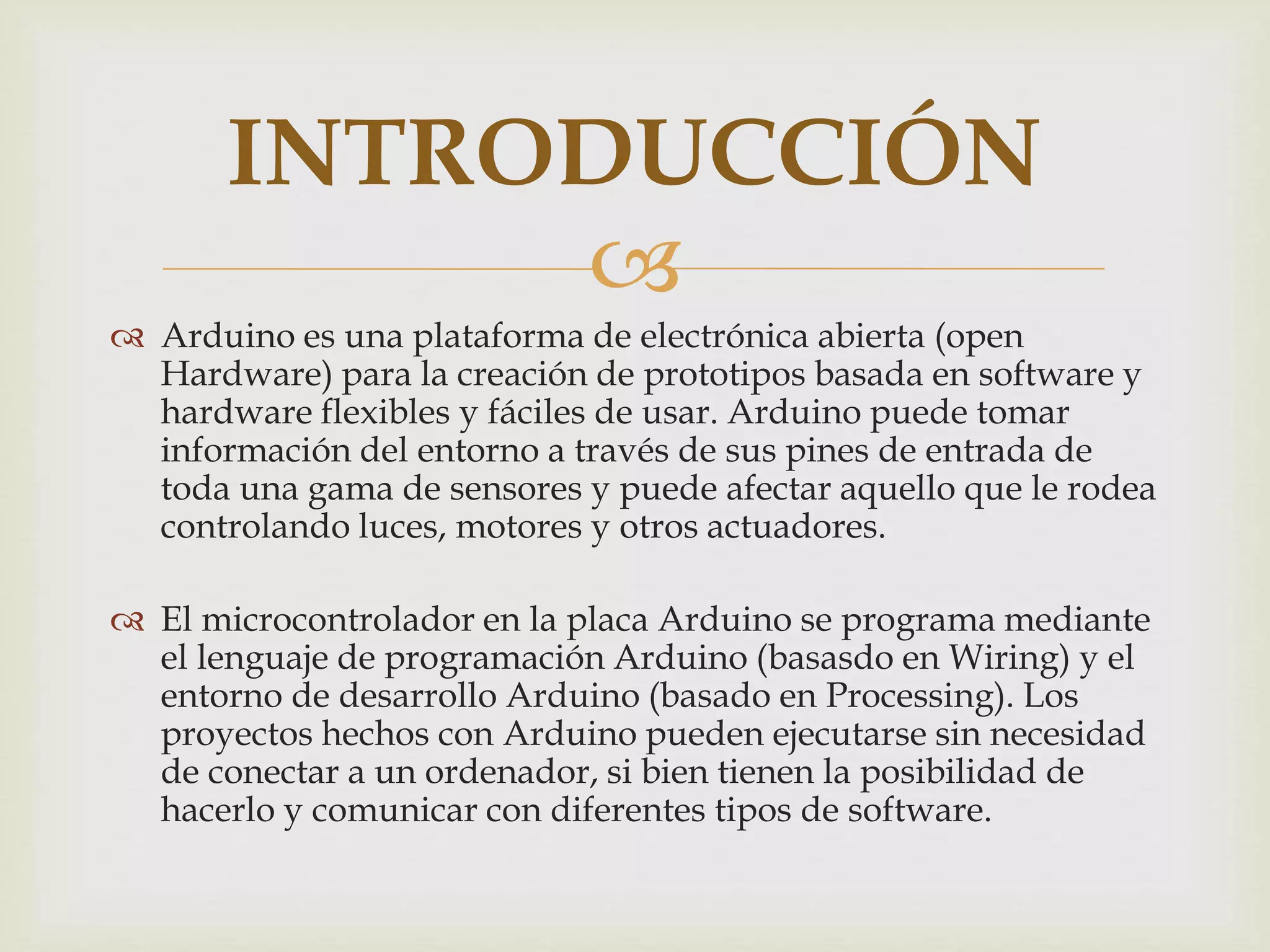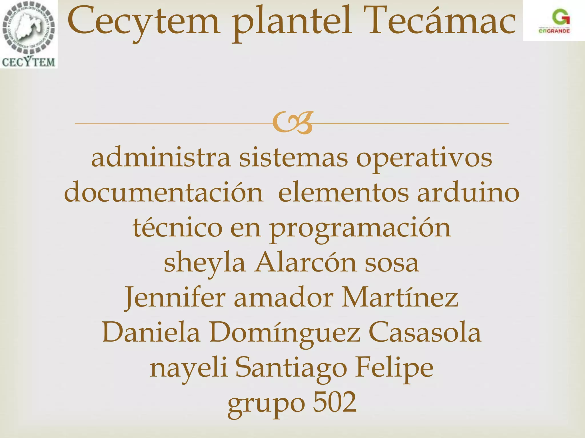 Este documento presenta información sobre los componentes electrónicos Arduino, incluyendo un servomotor, sensor de humedad DHT22, sensor de temperatura y un led. Explica cómo conectar estos componentes a la placa Arduino y qué función cumplen, como medir humedad, temperatura y encender un led. El objetivo final era que los estudiantes aprendieran a utilizar estos componentes de Arduino para crear nuevos proyectos tecnológicos.