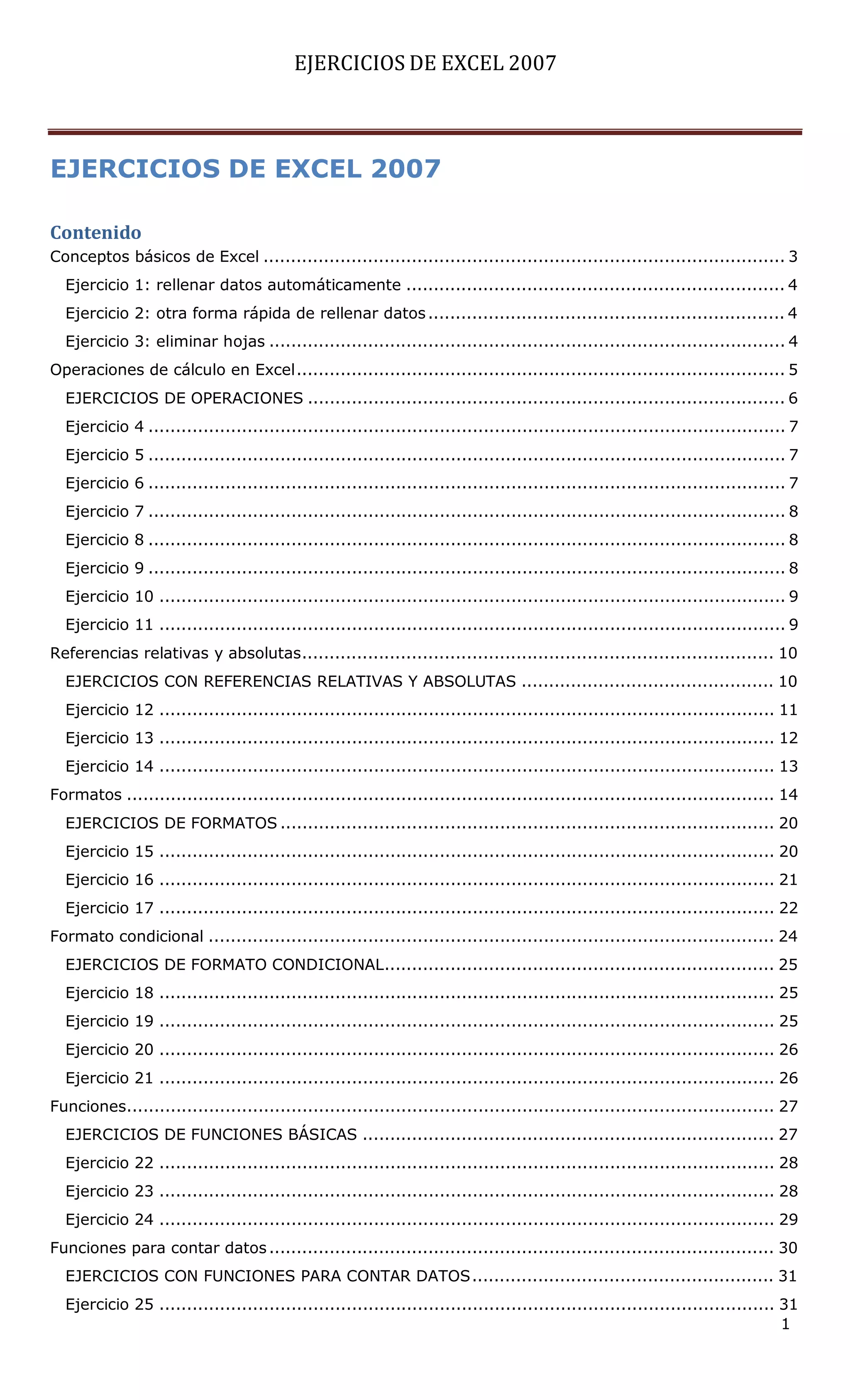 Este documento presenta 27 ejercicios sobre conceptos y funciones básicas de Excel 2007, incluyendo el rellenado automático de datos, operaciones matemáticas, referencias relativas y absolutas, formatos condicionales y de texto, y funciones como SUM y COUNT. Los ejercicios guían al usuario a través de pasos específicos para practicar y comprender los conceptos centrales de Excel.