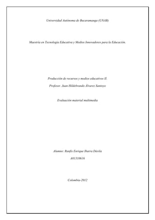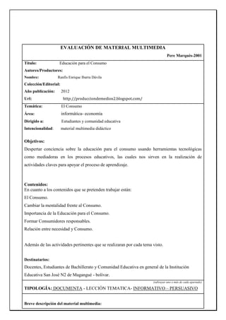 Este documento evalúa un material multimedia titulado "Educación para el Consumo" creado por Ranfis Enrique Ibarra Dávila en 2012. El material busca despertar conciencia sobre la educación para el consumo usando herramientas tecnológicas. Cubre temas como el consumo, cambiar la mentalidad frente al consumo, la importancia de la educación para el consumo y formar consumidores responsables. El evaluador encontró que el material es eficaz y relevante para sus objetivos educativos y lo calificó con una nota final de 4