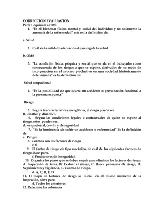 El documento presenta definiciones relacionadas con salud ocupacional, riesgos laborales y seguridad industrial. Incluye términos como salud, riesgo, peligro, factores de riesgo, accidente de trabajo, inspección de áreas, control de riesgos y más. Contiene preguntas para evaluar el conocimiento sobre estos conceptos y su aplicación en el ámbito laboral.