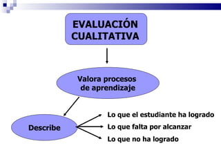 El documento describe diferentes técnicas y herramientas para evaluar el aprendizaje de los estudiantes bajo un enfoque de competencias, incluyendo observaciones, registros, listas de verificación, escalas de valoración, carpetas de evaluación, proyectos y coevaluación. El objetivo es monitorear el progreso del estudiante, identificar áreas de oportunidad y proveer retroalimentación formativa.