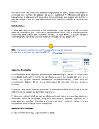 El documento presenta información sobre tres páginas web educativas. La primera página es publicada por un grupo de investigación y contiene información sobre informática para estudiantes. La segunda página es un proyecto de aprendizaje colaborativo en línea que permite crear y consultar cursos. La tercera página fue creada por un ingeniero y una universidad y contiene información sobre computadoras para diferentes niveles educativos.