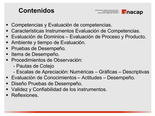Este documento describe diferentes instrumentos y procedimientos para evaluar competencias. En resumen: