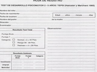 Este documento presenta información sobre el desarrollo psicomotor en niños. Incluye definiciones de crecimiento y desarrollo, las etapas del desarrollo del sistema nervioso, hitos del desarrollo motriz, lenguaje, alimentación y autonomía personal. También describe la Escala Abreviada del Desarrollo, una herramienta para evaluar el desarrollo psicomotor en niños de hasta 72 meses.