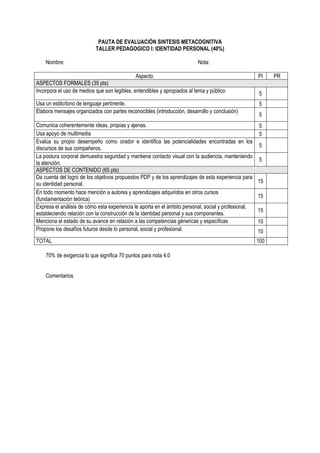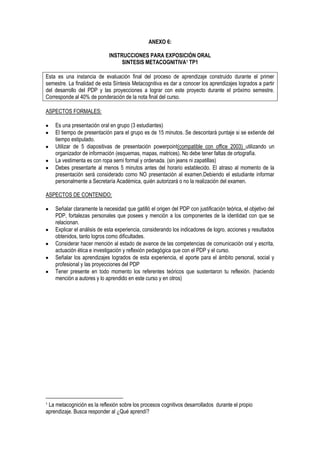 Este documento presenta las instrucciones para la exposición oral de la Síntesis Metacognitiva del primer semestre. Los estudiantes deben presentar en grupos de 3 los aprendizajes logrados a partir del desarrollo de su Proyecto de Desarrollo Personal (PDP) utilizando 5 diapositivas PowerPoint. La presentación debe durar 15 minutos e incluir una introducción, desarrollo y conclusión. Se evaluará el contenido, la forma y la comunicación. El objetivo es que los estudiantes reflexionen sobre sus aprendizajes y proyecten
