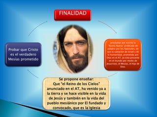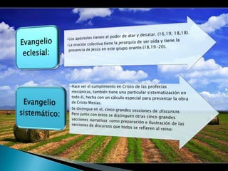 El Evangelio de San Mateo presenta a Jesús como el Mesías esperado por Israel, cuyas enseñanzas y acciones cumplen las profecías del Antiguo Testamento. Mateo escribió su evangelio probablemente entre los años 80-90 d.C. en Siria o Palestina, dirigido a una comunidad judía cristiana para instruirla sobre la vida y enseñanzas de Jesús y animarla a vivir según los mandamientos del Reino de los Cielos. El evangelio contiene narraciones sobre la vida pública de Jesús,