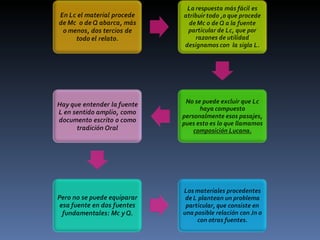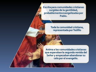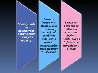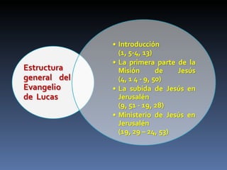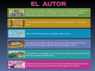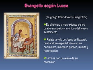 El evangelio de Lucas narra la vida de Jesús, centrándose en su nacimiento, ministerio, muerte y resurrección. Fue escrito probablemente en los años 80 d.C. por Lucas, un médico y compañero de Pablo, para ayudar a los lectores cristianos de origen gentil a comprender su fe.