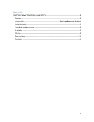 El documento describe un experimento realizado en un evaporador de doble efecto en el Instituto Tecnológico de Oaxaca. Se presentan los objetivos, equipo, procedimiento y resultados del experimento. Se midieron parámetros como temperatura, presión, masa y entalpía en cada efecto para evaluar la transferencia de calor, eficiencia térmica y capacidad de evaporación del sistema.
