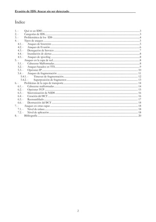 El documento describe diferentes tipos de ataques para evadir sistemas de detección de intrusos (IDS). Explica que los ataques de inserción envían paquetes inválidos que el IDS acepta pero que el sistema objetivo rechaza, mientras que los ataques de evasión explotan inconsistencias entre cómo el IDS y el sistema objetivo procesan los paquetes para que el IDS rechace paquetes válidos. También cubre problemas comunes de los IDS como falsas alarmas y su vulnerabilidad a ataques de denegación de servicio