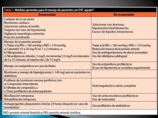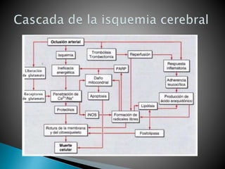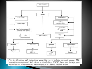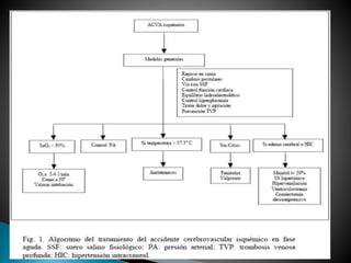 Este documento describe el síndrome clínico del accidente cerebrovascular isquémico (ACVI), sus causas, factores de riesgo, manifestaciones clínicas, pruebas de diagnóstico y tratamiento. El ACVI se produce por la obstrucción de un vaso cerebral, causando daño en el tejido cerebral afectado. Sus principales causas son la ateroesclerosis, el cardioembolismo y la enfermedad de pequeños vasos. El diagnóstico requiere exámenes clínicos, de laboratorio e imágenes como la TC, RM