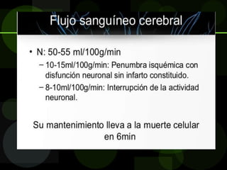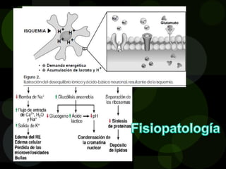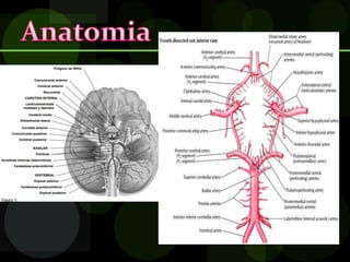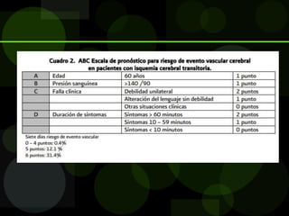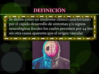 El documento define la enfermedad vascular cerebral (EVC), describe su epidemiología e identifica factores de riesgo. La EVC es la tercera causa de muerte y una de las principales causas de consulta, con una incidencia que aumenta exponencialmente con la edad. Los principales factores de riesgo son la edad avanzada, el sexo masculino, la hipertensión y el tabaquismo. Existen dos tipos principales de EVC, isquémica y hemorrágica, cada una con características clínicas y factores etioló