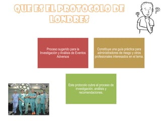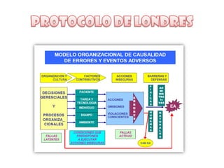 Este documento presenta un protocolo para la investigación y análisis de eventos adversos. Explica el proceso de investigar un evento adverso, identificar las acciones inseguras y las condiciones asociadas, y hacer recomendaciones para mejorar las debilidades. El objetivo es comprender los factores que contribuyeron al evento y promover una cultura de seguridad en la organización.
