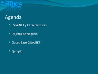 El documento describe las características del framework CSLA.NET para objetos de negocio. CSLA.NET proporciona clases base para crear objetos de negocio editables e de sólo lectura que soportan data binding, validación, autorización y deshacer cambios. También incluye clases para listas clave-valor y comandos. El framework abstrae el transporte entre cliente y servidor usando tecnologías como .NET Remoting, Enterprise Services y Web Services, proporcionando seguridad centralizada.