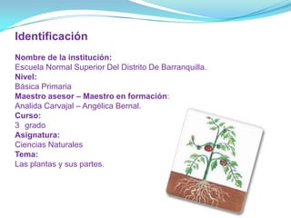Este documento presenta una lección sobre las partes de las plantas para estudiantes de tercer grado. La lección incluye objetivos de aprendizaje, actividades como dibujar y observar plantas, y preguntas para profundizar el conocimiento sobre las funciones de las raíces, tallos, hojas, flores y frutos. La evaluación consiste en identificar las partes de una rosa.