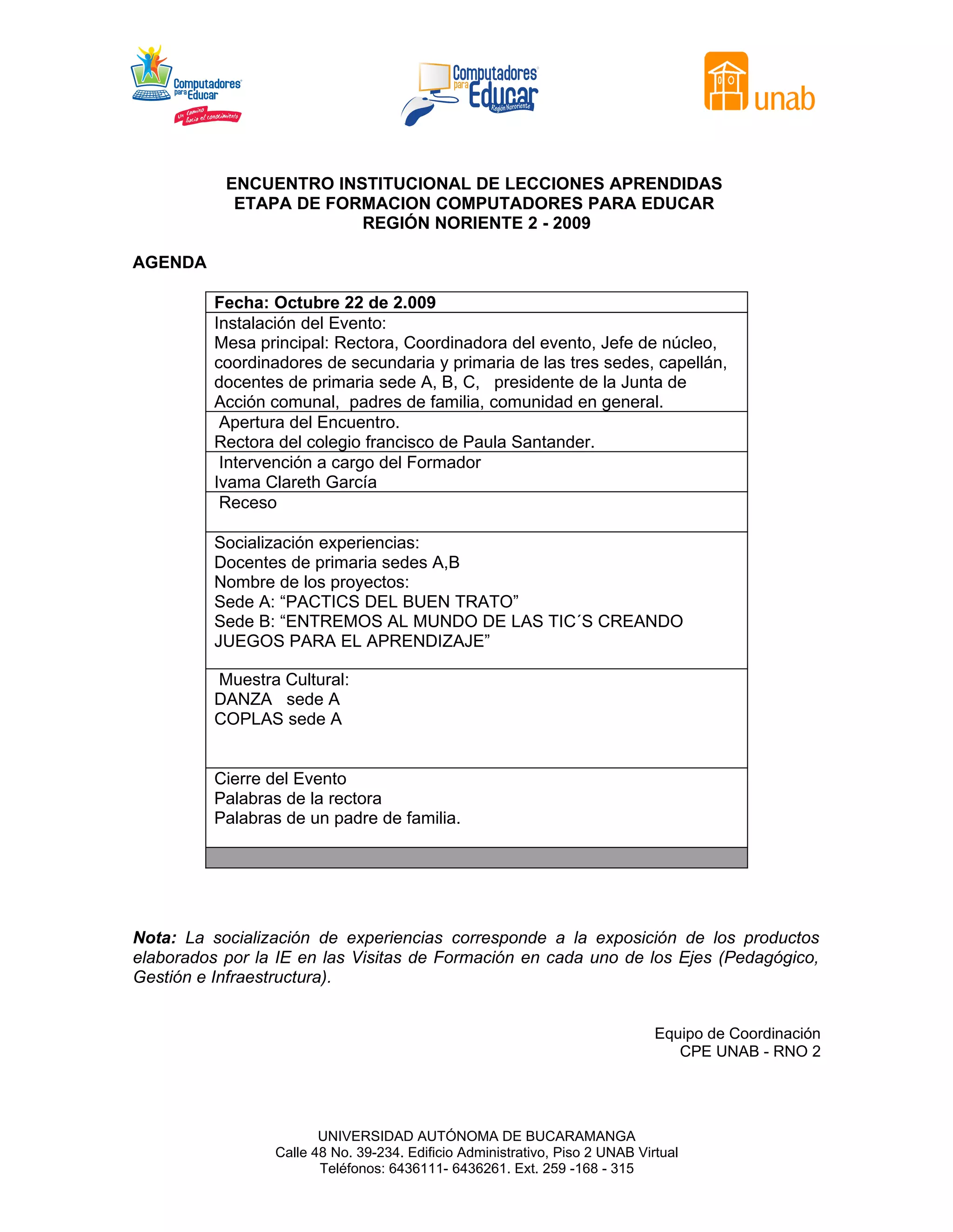 El documento presenta la agenda de un encuentro institucional realizado en octubre de 2009 en el Colegio Francisco de Paula Santander. La agenda incluye la instalación del evento, una apertura a cargo de la rectora, una intervención del formador Ivama Clareth García, la socialización de experiencias de docentes de dos sedes que incluyeron proyectos sobre el buen trato y las TIC, una muestra cultural de danza y coplas, y un cierre con palabras de la rectora y un padre de familia.