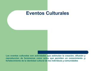 Los eventos culturales incluyen conciertos, exposiciones y ferias que permiten el conocimiento y fortalecimiento de la identidad cultural. Al realizar estos eventos es importante considerar la institución organizadora, el tema de trascendencia académica o social, los objetivos para públicos específicos, los ponentes influyentes, los participantes calificados, el origen en términos de intereses y edades del público, y el lugar y duración del evento.