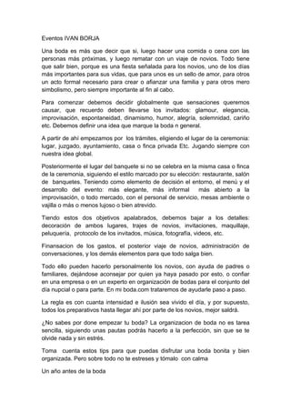 Una boda requiere mucha planificación para asegurar que todo salga bien en el día más importante de los novios. Los organizadores deben decidir la sensación general que quieren crear, luego elegir los lugares para la ceremonia y recepción, y los detalles como decoración, comida, vestuario y entretenimiento. Con anticipación, una cuidadosa planificación y enfoque en lo que es más importante para los novios, la boda puede ser memorable.
