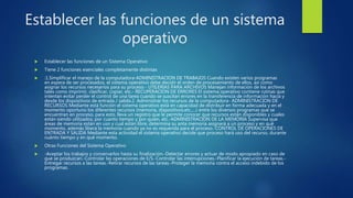 El documento describe las funciones principales de un sistema operativo. Explica que un sistema operativo tiene dos funciones esenciales: 1) simplificar el manejo de la computadora mediante la administración de trabajos, utilidades para archivos y la recuperación de errores, y 2) administrar los recursos de la computadora como la memoria, dispositivos y CPU. También identifica otros recursos que el sistema operativo administra como la memoria, dispositivos de almacenamiento y periféricos de entrada/salida.