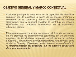 Este documento describe una estrategia para implementar recursos educativos abiertos y coaching en instituciones que trabajan con la primera infancia en Sincelejo, Colombia. La estrategia incluye capacitar al personal sobre el uso de recursos abiertos y coaching, motivar al personal, adecuar la infraestructura, y crear repositorios para compartir recursos entre instituciones. Se identifican varias fuentes en línea de recursos educativos abiertos. Los resultados esperados son la actualización continua del personal, participación activa de agentes educativos e infantes, y