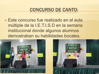 La semana institucional en la Escuela Técnica Industrial Simona Duque incluyó varios eventos como un concurso de canto, una casa del terror, exposiciones académicas, una chocolatada, una exposición de tecnología, un concierto y un concurso nacional de robótica en el que los estudiantes participaron y aprendieron.