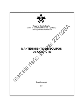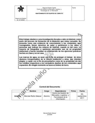 Este documento trata sobre el mantenimiento de equipos de cómputo en el Centro de Gestión de Mercados, Logística y Tecnologías de la Información. Incluye instrucciones para instalar el sistema operativo Linux y diseñar un banco de trabajo utilizando un diodo LED para reemplazar una bombilla. El documento fue escrito por Marcela Riaño Salazar en septiembre de 2011.