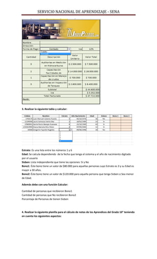 Este documento presenta 6 ejercicios prácticos en Excel relacionados con temas como macros, facturación, tablas dinámicas, cálculo de notas, búsqueda de datos y gráficos. Los ejercicios involucran funciones como IVA, descuentos, promedios, condicionales, referencias, entre otros. El objetivo es evaluar conocimientos básicos en herramientas ofimáticas a través de la resolución de casos prácticos de la vida real.
