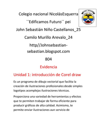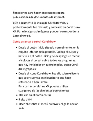Este documento resume las funciones básicas de Corel Draw como un programa de dibujo vectorial profesional que permite crear ilustraciones desde logotipos hasta diseños técnicos complejos. Explica cómo abrir y cerrar Corel Draw, y describe cómo crear objetos básicos como rectángulos, círculos y otras formas que pueden modificarse en tamaño y forma. También cubre cómo abrir y guardar archivos de Corel Draw.