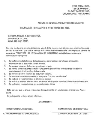El documento informa sobre las actividades realizadas en la escuela primaria rural '21 de marzo' durante el ciclo escolar 2009-2010, destacando el fomento de la lectura a través de diversas iniciativas como carteles, eventos de lectura y la creación de reglamentos para la biblioteca. Se menciona un evento especial llamado 'día del libro' donde participaron todos los alumnos, y se anexan evidencias del progreso del programa. Las actividades están orientadas a promover la lectura y el uso de la biblioteca escolar entre los estudiantes.