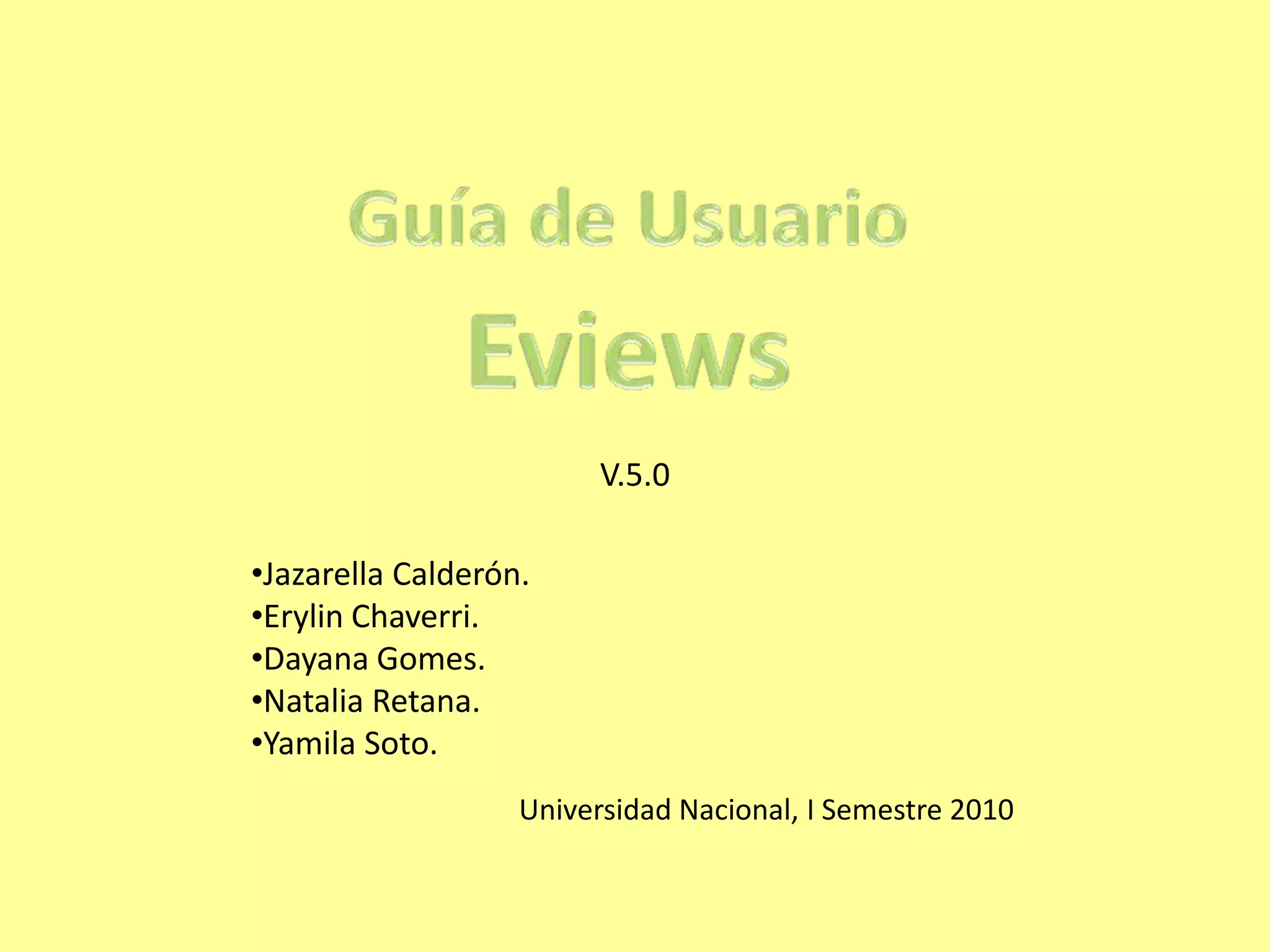 Este documento provee una guía de usuario del programa Eviews. Explica que Eviews es un programa de análisis econométrico y estadístico desarrollado por la compañía Quantitative Micro Software. Describe cómo importar datos a Eviews desde Excel y crear gráficos y tablas estadísticas. También cubre cómo crear modelos de regresión para analizar la relación entre variables y hacer predicciones.