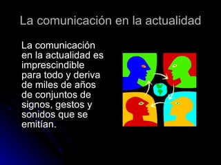 La comunicación ha evolucionado de los primeros sonidos y gestos de nuestros antepasados hasta convertirse en una parte esencial de la vida moderna, pasando por la creación de la escritura, los jeroglíficos egipcios, el alfabeto griego y materiales como el papiro y el papel. Actualmente, contamos con múltiples medios de comunicación como la prensa, la radio, la televisión, Internet y las redes sociales que nos permiten transmitir y recibir información de forma casi instantánea desde cualquier lugar.